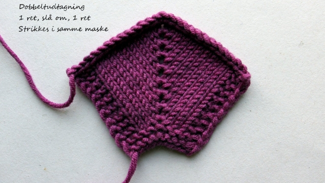 Har du brug for at tage to masker ud i en maske, kan du denne udtagning. Strik 1 ret uden at tage masken af pinden, slå om og strik igen 1 ret i samme maske. Forkortelse: (1r, so, 1r) i en maske Engelsk forkortelse: K, YO, K
