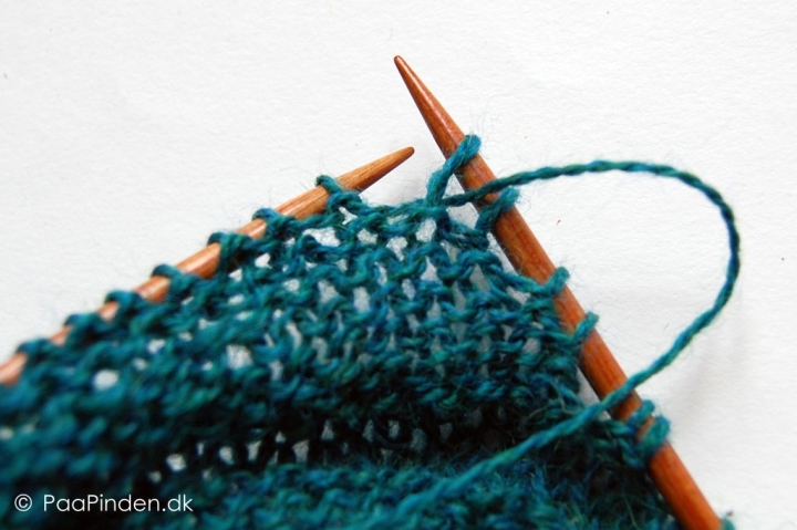 Garnet foldes rundt om næste maske når der vendes. Masken strikkes ikke.