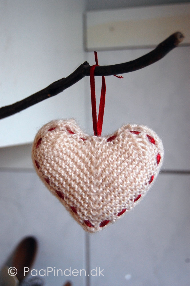 Jeg strikkede blot to hjerter, syede dem sammen, fyldte dem ud og bandt et bånd i kanten. Her kan I følge hjertet undervejs.
