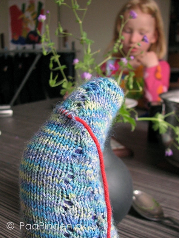 Tåen skulle ikke strikkes med den vante venderækkemetode med wrap & turn, hvor man folder garnet om den næste maske på pinden og herefter vender arbejdet. I stedet for skulle den strikkes ved at lave et omslag først på hver vendt pind, der senere skulle strikkes sammen med tilstødende maske. Det fungerede slet ikke for mig - aalt for store huller blev det til langs tæerne.