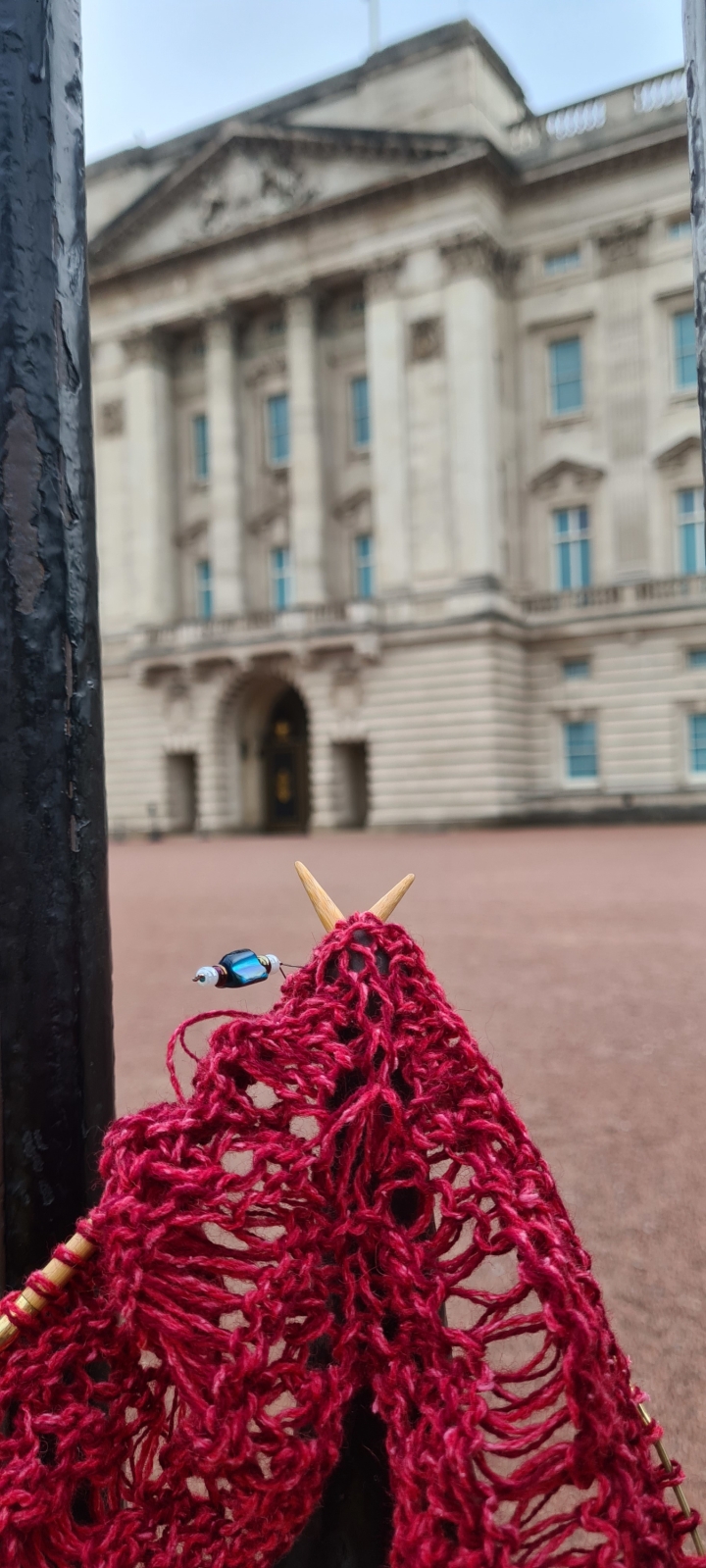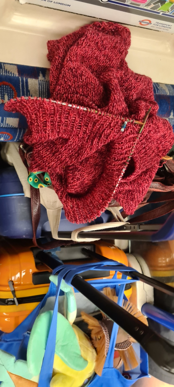Den røde Satawal kastede jeg mig over på en tur til London med en af mine døtre i sommers. Så den har været vidt omkring i London. Ethvert lille hvil byder jo på en chance for strik. Se bare med her. Det startede ud med Take off & Cast on.