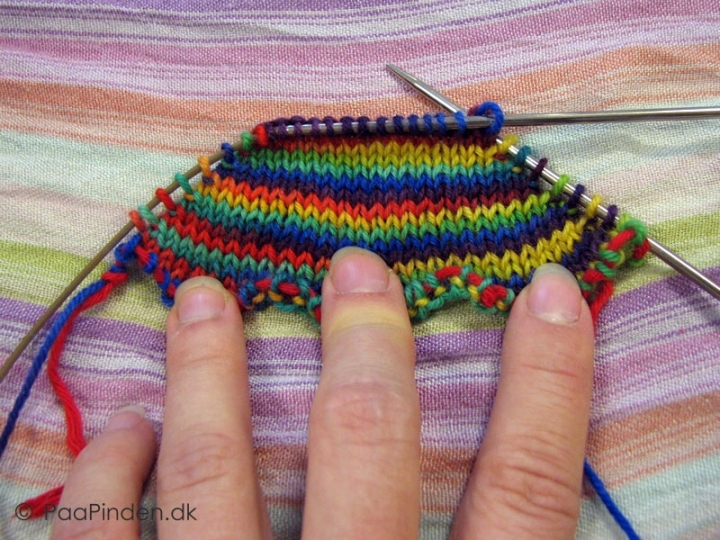 Dernæst strikkes der igen venderækker, hvor der strikkes en maske mere pr. gang og således formes tåen.