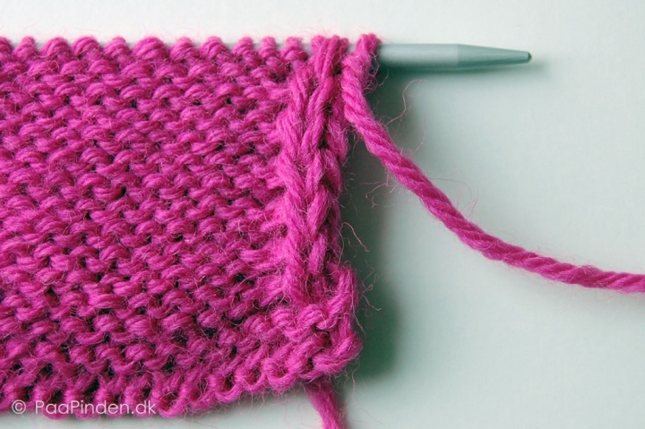 Slå 3 m op, strik 2 m ret i den første m, 2 r, sæt 3 masker tilbage på venstre pind - strik 2 r i første m, 2 r, sæt 3 m tilbage på venstre pind - fortsæt på denne måde til ønsket antal m. træk de 3 m sammen til 1 m, som bliver den sidste maske på opslaget.